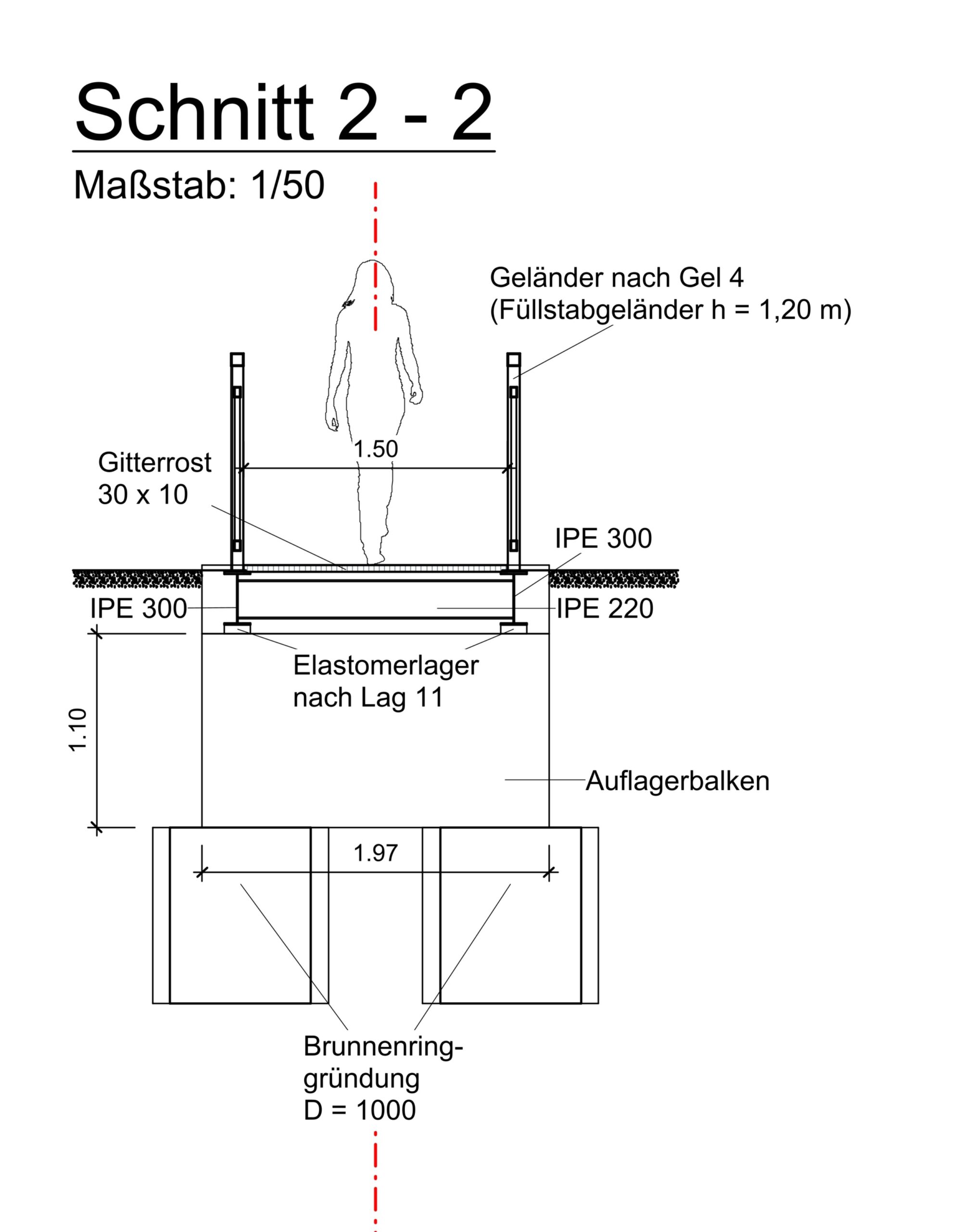 Die Brücke besteht aus standardisierten Stahlträgern und wird auf Brunnenringen gegründet. Die Widerlager entstehen in Ortbeton.